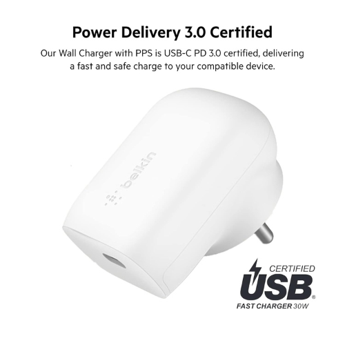 Belkin 30W USB-C Wall Charger with PPS PD 3.0, Fast Charger Plug- White
