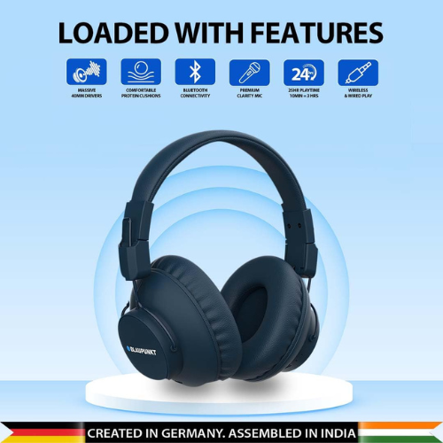 Blaupunkt BH41 Bluetooth Wireless Over-Ear Headphones are designed for users who want powerful sound, long playtime, and comfort in a sleek form. Featuring 40mm drivers, they deliver clear, high-quality audio with deep bass and balanced tones, making them suitable for music, movies, and calls. With long battery life, they allow extended listening sessions without frequent recharging, while TurboVolt fast charging ensures quick power-ups to keep you going. The headphones are built with a foldable and lightweight design, making them easy to carry and store, perfect for travel or daily use. Their flexible build provides comfort for long hours of wear, while the built-in microphone supports hands-free calling and smooth communication.