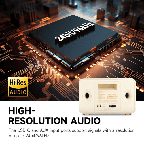 Edifier D32 Tabletop Wireless Speaker is a retro-inspired, high-fidelity audio system that combines vintage aesthetics with modern technology. Encased in a handcrafted wooden cabinet, the D32 features a distinctive accordion-style keyboard and braided speaker grille, making it a stylish addition to any room. The speaker supports high-resolution audio up to 24bit/96kHz, thanks to its end-to-end digital signal processing and dual Class-D amplifiers from Texas Instruments. These amplifiers facilitate precise two-way active crossover and dynamic range control, ensuring accurate audio reproduction across the frequency spectrum. Connectivity options are extensive, including Bluetooth 5.3 with support for SBC, AAC, LDAC, and ALAC codecs, as well as dual-band Wi-Fi compatibility with Apple AirPlay 2. Additional inputs include USB-C and AUX, providing versatility for various audio sources.