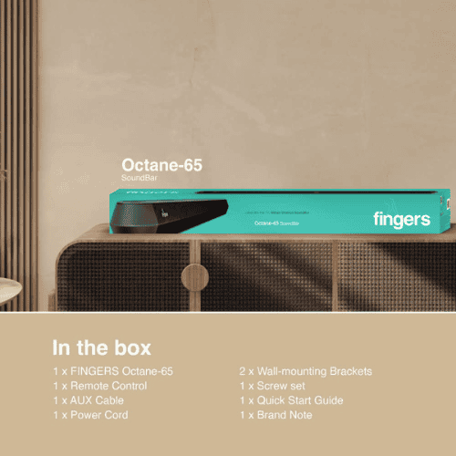 Fingers Octane-65 Multimedia Sound Bar delivers powerful 65-watt audio performance with a 2.0 channel setup, offering clear, immersive sound for movies, music, and gaming. It features versatile connectivity options including Bluetooth, USB, AUX, Optical, and HDMI ARC, allowing seamless integration with TVs, smartphones, and other devices. The soundbar is wall-mountable, providing flexible placem ent options, and comes with a remote control for convenient operation.