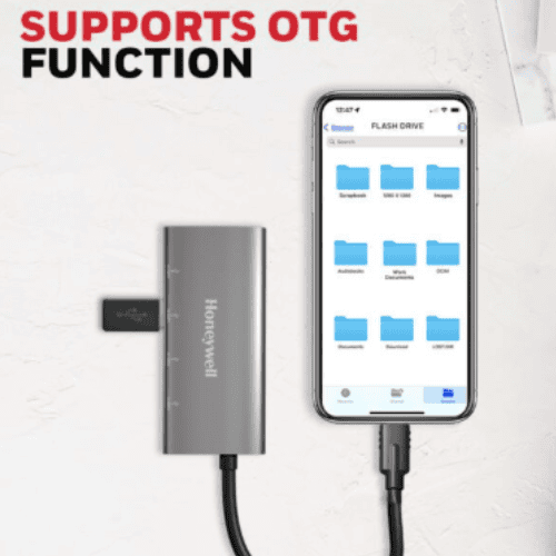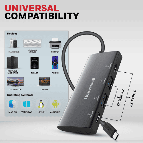 Honeywell Momentum Type C to 4-in-1 Hub is a compact and efficient solution designed to enhance connectivity for modern devices. Equipped with two Type-C and two USB 3.2 Gen 2 ports, it offers high-speed data transfer rates of up to 10 Gbps, facilitating seamless file sharing and device synchronization. The hub supports a maximum current output of 3000mA, ensuring efficient charging for smartphones, tablets, and other compatible devices. Its plug-and-play functionality allows for effortless setup without the need for additional drivers or software, making it ideal for users seeking a hassle-free experience. The hub’s universal compatibility with all Type-C port devices, including Windows laptops and MacBooks, ensures broad usability across various platforms. Additionally, its sleek and compact design makes it a convenient companion for both home and office use.