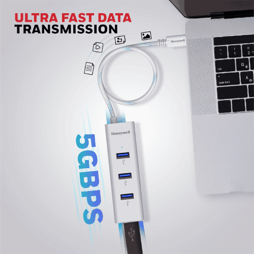 Sale!Honeywell 4-in-1 Ultra Slim USB Hub 1xUSB 3.0 & 3 x USB 2.0 Ports, 30cms Cable, Data Transfer Speed Upto 5GBPS- Grey