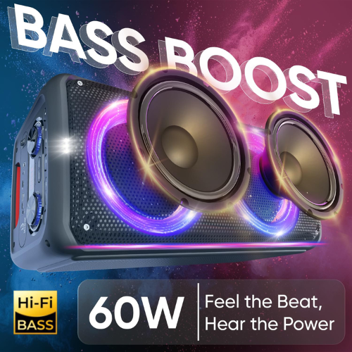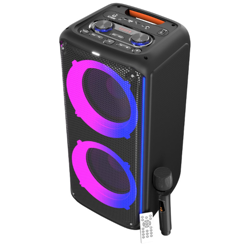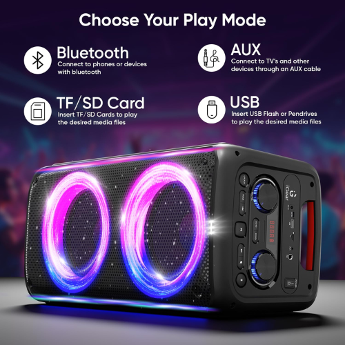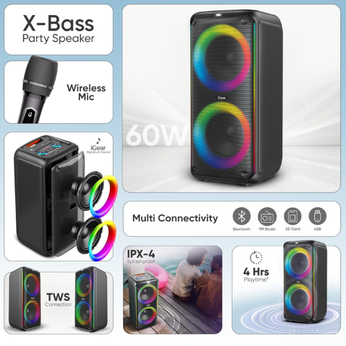 iGear X-Bass 60 iG-1061 is an ultimate 60W portable Bluetooth party speaker built to deliver booming sound and vibrant party vibes. Equipped with dual bass radiators, it produces deep, punchy bass that enhances every beat, while the included rechargeable karaoke microphone makes it perfect for sing-alongs and gatherings. The mesmerizing RGB lights add a dynamic visual effect, creating a true party atmosphere. With TWS mode, you can pair it with another speaker for a more powerful stereo experience. It also supports multiple playback options, including USB, TF/SD card, and AUX input, ensuring versatile connectivity.
