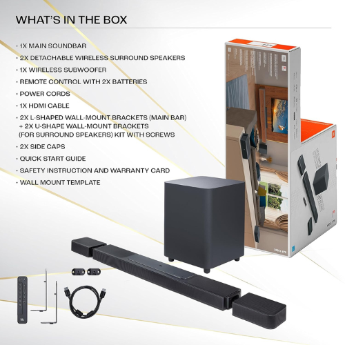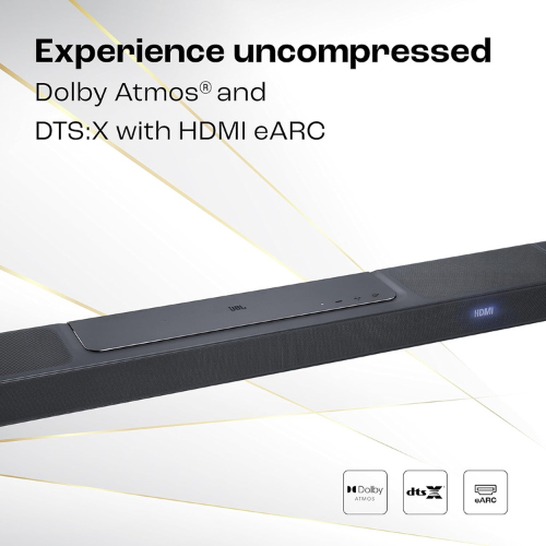 JBL Bar 1300 is a flagship 11.1.4 channel truly wireless soundbar designed to deliver a cinematic audio experience with unmatched power and precision. With an enormous 1170 watts of output, it pairs a premium soundbar with a 10-inch down-firing wireless subwoofer and detachable truly wireless surround speakers, creating a complete immersive setup without messy cables. True Dolby Atmos®, DTS:X, and JBL’s MultiBeam™ technology work together to produce a 3D soundscape that fills every corner of your room, making movies, music, and games feel more lifelike and engaging than ever before. The soundbar supports HDMI eARC with 4K Dolby Vision passthrough, ensuring uncompromised audio and video quality for a seamless home theater experience. PureVoice technology enhances dialogue clarity, while built-in Wi-Fi and Bluetooth enable effortless streaming from popular services. With Alexa integration and the JBL One App, you get smart control, easy customization, and direct access to your favorite playlists.