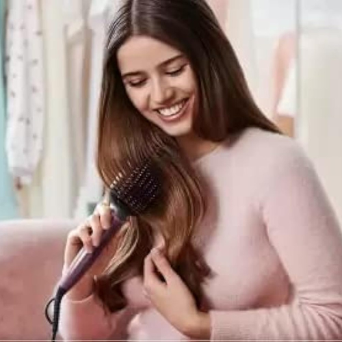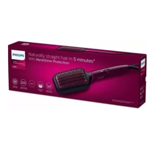 Philips BHH730/00 Hair Straightener Brush combines the convenience of a brush with the effectiveness of a straightener, giving you naturally straight and smooth hair in minutes. Equipped with SilkProtect technology, it ensures even heat distribution while minimizing heat damage, keeping hair healthy and frizz-free. The brush heats up quickly and is designed with wide bristles for effortless styling, making it ideal for everyday use. Its elegant dark wine finish adds a stylish touch, while the ergonomic design provides comfortable handling for quick, salon-like results at home.