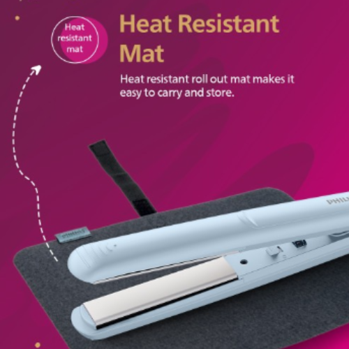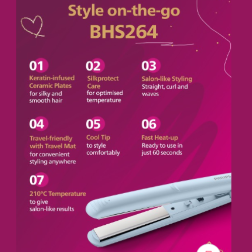 Philips BHS264/00 Hair Straightener in light blue is designed to provide smooth, sleek, and frizz-free hair with minimal effort. Its advanced heating technology ensures even heat distribution for effective styling while protecting hair from damage. Lightweight and ergonomically designed, it offers comfortable handling, making it ideal for daily use. The soft light blue color adds a stylish and modern touch to your hair care routine.