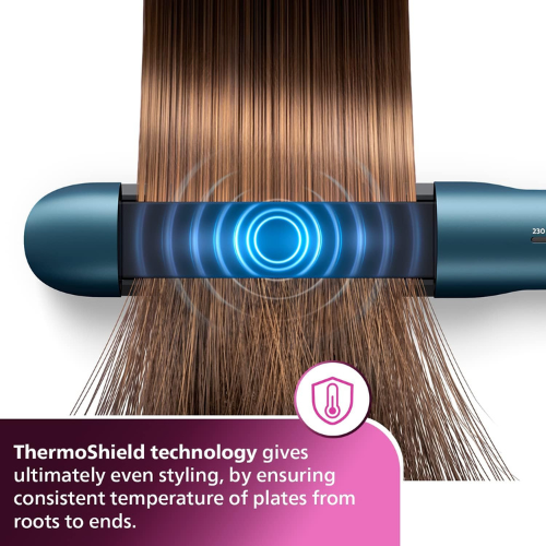 Philips BHS732/10 Hair Straightener from the 7000 Series combines advanced technology with user-friendly features to deliver smooth, shiny, and frizz-free hair. Equipped with ThermoShield technology, it regulates heat to ensure consistent styling from root to tip, reducing the risk of heat damage. The ceramic plates are infused with argan oil, providing a silky glide and enhancing hair’s natural shine. Additionally, the straightener features a 2x ionic care system that emits millions of negative ions, combating static and smoothing the hair cuticle for a polished finish. Designed for versatility, the Philips BHS732/10 offers a wide temperature range from 120°C to 230°C, accommodating various hair types and styling preferences. Its 105 mm long floating plates adjust pressure evenly across the hair, ensuring gentle styling.