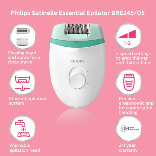 Philips BRE245/00 Corded Compact Epilator is a versatile grooming tool designed for gentle and effective hair removal at home. Offering a 2-in-1 function as both an epilator and shaver, it allows for smooth hair-free skin with minimal discomfort. Its compact design makes it easy to handle and maneuver, ensuring precision even in delicate areas. Ideal for quick touch-ups or regular hair removal, it combines convenience with efficiency for a complete at-home grooming experience.
