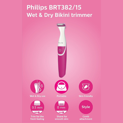 Philips BRT382/15 Women Cordless Bikini Trimmer 30 min Runtime 4 Length Settings (Pink)