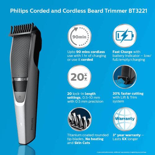 Philips BT3221/15 Smart Beard Trimmer is built with PowerAdapt technology that automatically adjusts to different beard thicknesses, ensuring consistent and precise trimming results every time. It offers 20 lock-in length settings, giving you the flexibility to style your beard with accuracy, whether you prefer a close stubble or a well-groomed fuller beard. With a powerful battery, the trimmer delivers up to 90 minutes of cordless runtime on a single charge, making it highly reliable for extended grooming sessions. Its durable stainless steel blades are self-sharpening, staying effective over time, while the ergonomic design provides comfort and control during use.