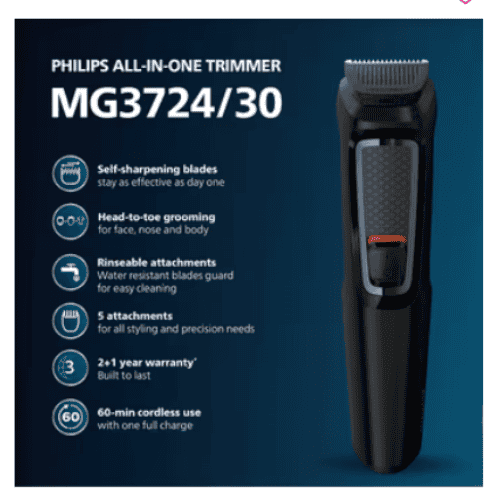 Philips MG3724/30 Self sharpening Blades, Single Stroke All-in One Multigroomer Trimmer (Black)
