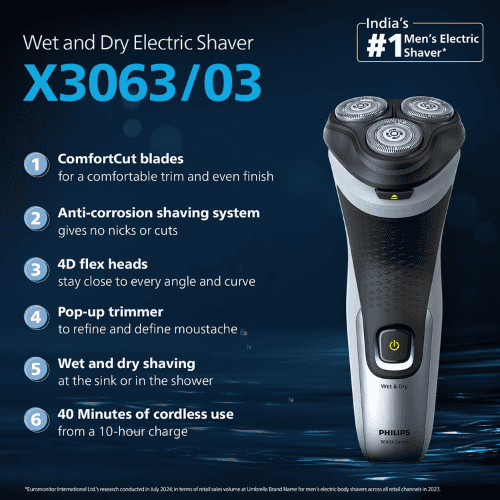 Philips X3063/03 Electric Shaver for men offers a comfortable and precise grooming experience with advanced SkinProtect Technology, reducing irritation while ensuring a close shave. Its 3D floating heads adapt to the contours of the face and neck for smooth results, even in hard-to-reach areas. Equipped with 27 self-sharpening blades and a pop-up trimmer, it allows for both detailed trimming and complete shaving. Suitable for wet and dry use, this cordless and waterproof shaver provides flexibility and convenience for daily grooming routines.