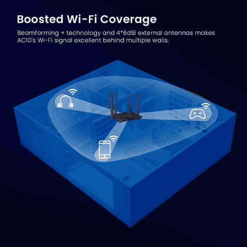 Tenda AC10 AC1200 Wireless Smart Dual-Band Gigabit WiFi Router is engineered to provide robust and high-speed wireless performance for home or small office environments. Features:- Dual-Band AC1200: Offers combined speeds of up to 1200 Mbps (867 Mbps on 5 GHz and 300 Mbps on 2.4 GHz). MU-MIMO Technology: Supports multiple devices simultaneously with improved performance. Four Gigabit Ports: Provides high-speed wired connections for devices. VPN Server Support: Enables secure remote network access.