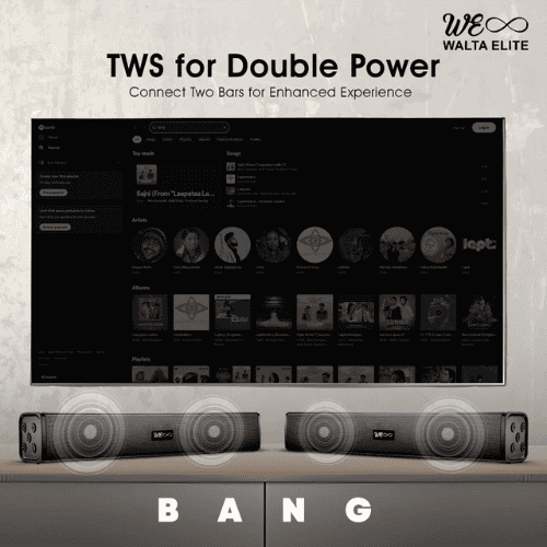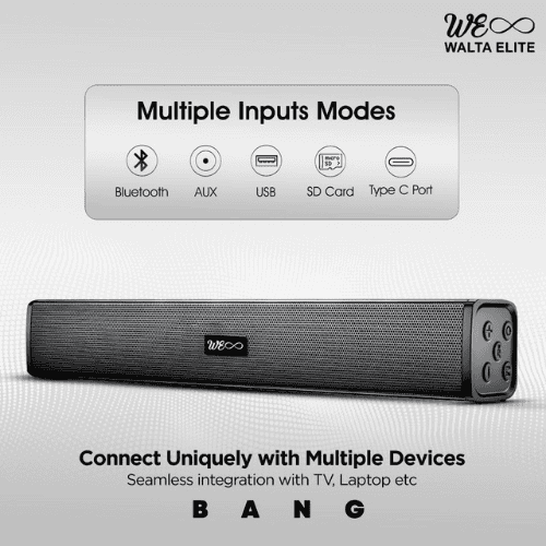 Walta Elite Bang is a compact 10W wireless Bluetooth soundbar designed for versatile audio experiences. Equipped with a 52mm driver, it delivers clear stereo sound suitable for various settings. Powered by a 1500mAh lithium polymer battery, the speaker offers up to 7 hours of playback time on a single charge, with a charging duration of approximately 1.5 hours. Connectivity options include Bluetooth 5.3 with a range of up to 10 meters, as well as AUX, USB, and SD card inputs, providing flexibility for different audio sources.