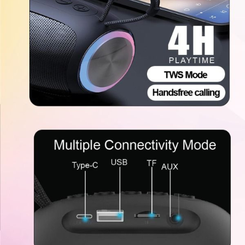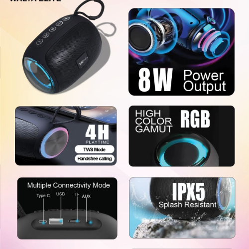 The Walta Elite Brio 1111 is a compact yet powerful Bluetooth speaker designed for portability and versatile listening. With 8 watts of output power, it delivers clear and dynamic sound suitable for both indoor and outdoor use. The vibrant RGB lighting adds a colorful visual element, perfect for parties and gatherings. Equipped with Bluetooth 5.3, it ensures a stable, efficient wireless connection with extended range and low latency. Featuring TWS mode, two Brio 1111 speakers can be paired for a true stereo experience, enhancing audio depth and overall sound quality.