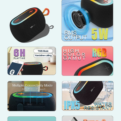 The Walta Elite Brio 1120 is a compact yet feature-packed Bluetooth speaker that combines portability with impressive sound performance and vibrant RGB lighting. With a 5W RMS output, it delivers clear and balanced audio, making it ideal for personal listening, small gatherings, or background music. The colorful RGB lighting adds an engaging visual element, enhancing the overall atmosphere. Featuring TWS mode, two Brio 1120 speakers can be paired to create a stereo setup with distinct left and right channels for a more immersive sound experience. With multiple connectivity options, including Bluetooth 5.3, AUX, USB, and TF card support, the speaker provides versatile playback for a wide range of devices and media sources.