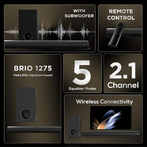 The Walta Elite Brio 1275 Soundbar Party Speaker is crafted for those who seek powerful audio performance and advanced connectivity for home entertainment and events. With an impressive 200W output, it delivers immersive and dynamic sound capable of filling large rooms or outdoor spaces with clarity and depth. The speaker enhances every beat with rich bass, clear mids, and crisp highs, ensuring a premium listening experience for music, movies, or parties. Equipped with the latest Bluetooth 5.3 technology, it enables seamless wireless streaming with minimal latency and an extended range for flexible use. Its versatile input options, including HDMI ARC, optical, auxiliary, and USB ports, provide easy compatibility with TVs, smartphones, tablets, and gaming consoles. Optimized for parties, the Brio 1275 keeps the energy high with its powerful and vibrant sound performance.