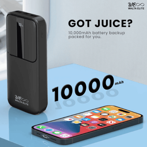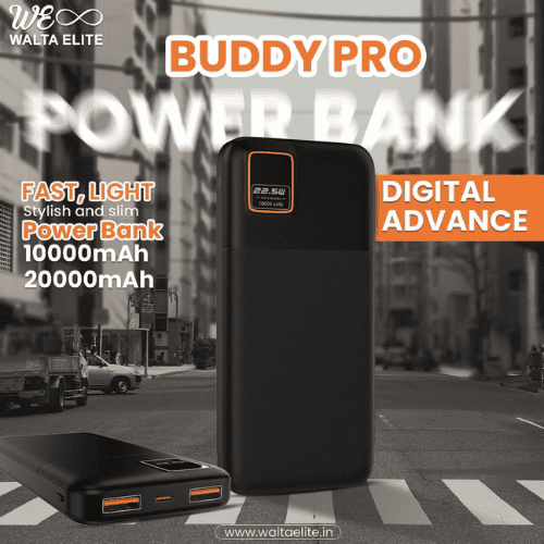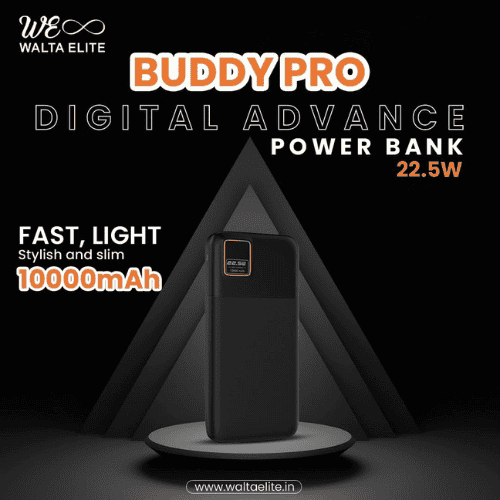Walta Elite Buddy Pro Digital Advance 10000 Power Bank is a high-performance portable charger designed to provide efficient and rapid charging for your devices. Here’s a detailed description of its features: Design and Build Quality: The WALTA ELITE Buddy Pro Digital Adv 10000 Power Bank features a sleek and durable design in black, combining portability with robust build quality. Its compact size allows for easy storage in bags or pockets, making it convenient for travel and daily use. Battery Capacity: Equipped with a powerful 10000mAh lithium polymer battery, the Buddy Pro Digital Adv 10000 offers ample power to charge smartphones, tablets, and other USB-powered devices multiple times. This capacity ensures reliable power supply throughout the day, making it ideal for long trips or emergencies.