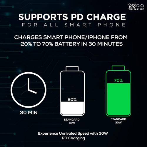 Walta Elite Panache 5 Car Charger is a high-performance charger designed to meet the needs of modern devices. It delivers fast, efficient charging with up to 30W of power, ensuring your devices charge quickly, saving you time during your travels. It is equipped with both a Type-C and USB port, it allows you to charge two devices at once, offering flexibility for different device types.