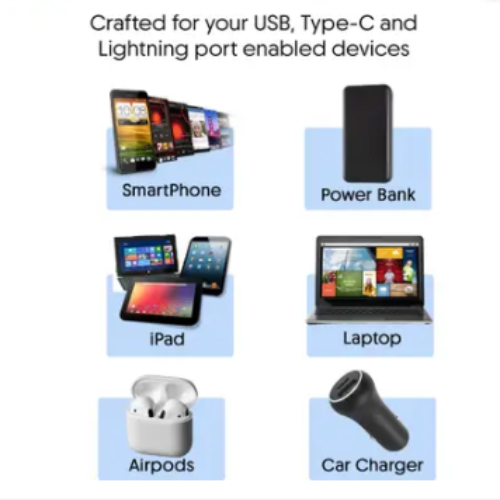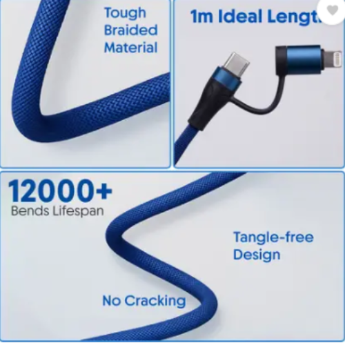 The WALTA ELITE Wave 1 Pro Adv 4-in-1 Fast Charging Data Cable is a versatile and durable solution for all your charging needs. With a powerful 65W fast-charging capability, this 1-meter cable ensures efficient charging and seamless data transfer across multiple devices. Designed with four connectors—Type-C, Lightning, and Micro USB—it offers universal compatibility for iPhones, Android smartphones, tablets, and other USB-powered gadgets. The cable features a strong and flexible build with a premium braided exterior, ensuring long-lasting durability and resistance to wear and tear. Its compact design makes it easy to carry, while the vibrant blue color adds a stylish touch to your tech accessories. Ideal for home, office, or travel use, the WALTA ELITE Wave 1 Pro Adv 4-in-1 Cable delivers reliable performance and convenience in one smart design.